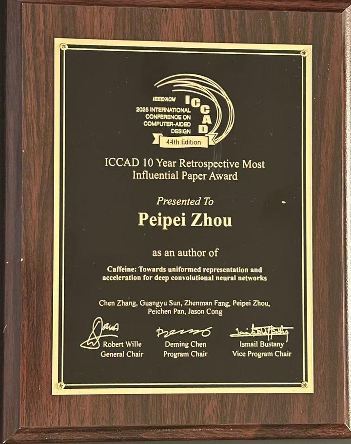 π£ π£ π£ Prof. Zhou was honored with the 10-Year Retrospective Most Influential Paper Award at the 2025 Institute of Electrical and Electronics Engineers (IEEE)/Association for Computing Machinery (ACM) International Conference on Computer-Aided Design (ICCAD), held in Munich, Germany in October. The award recognizes the lasting impact of the 2016 paper, βCaffeine: Towards uniformed representation and acceleration for deep convolutional neural networks,β co-authored by Zhou with her Ph.D. adviser Jason Cong (UCLA), Chen Zhang (Shanghai Jiao Tong University), Guangyu Sun (Peking University), Zhenman Fang (Simon Fraser University), and Peichen Pan (Falcon-Computing Solutions).